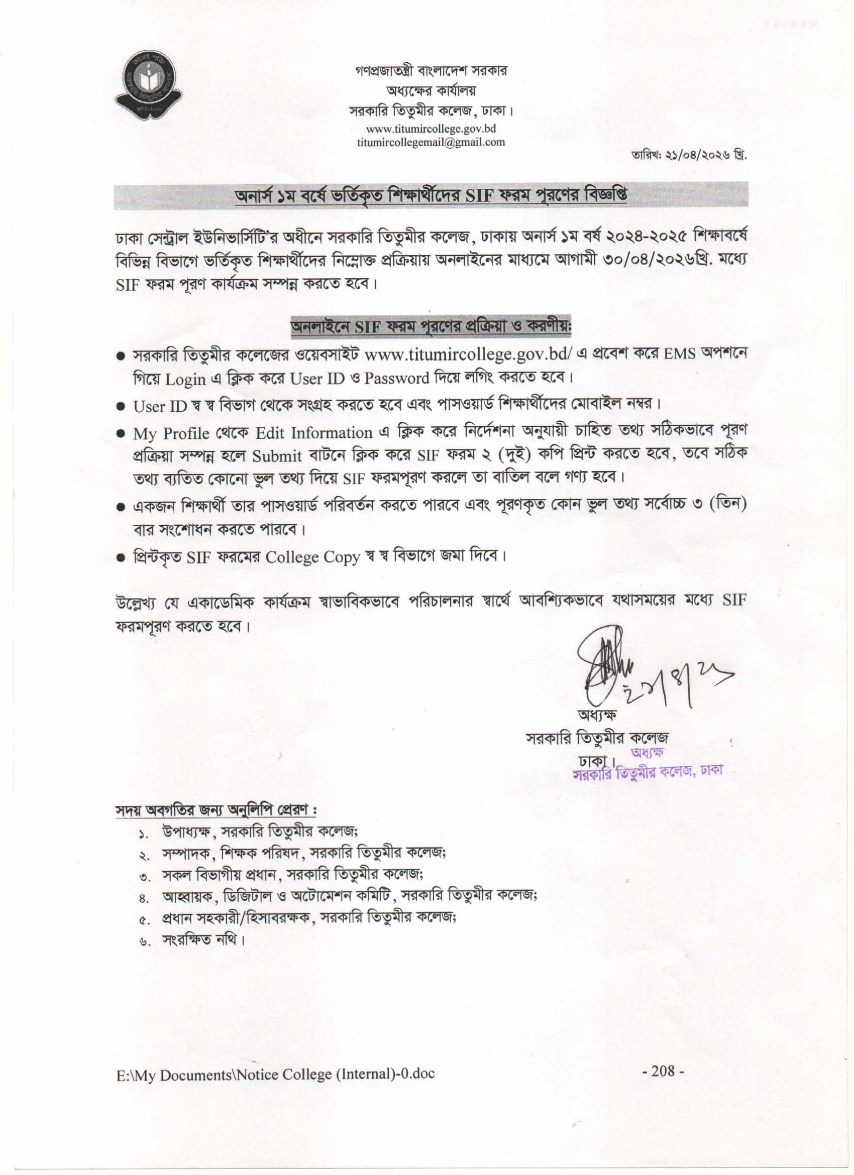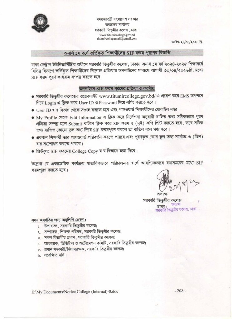 অনার্স ১ম বর্ষ ভর্তিকৃত শিক্ষার্থীদের SIF ফরম পূরণের বিজ্ঞপ্তি