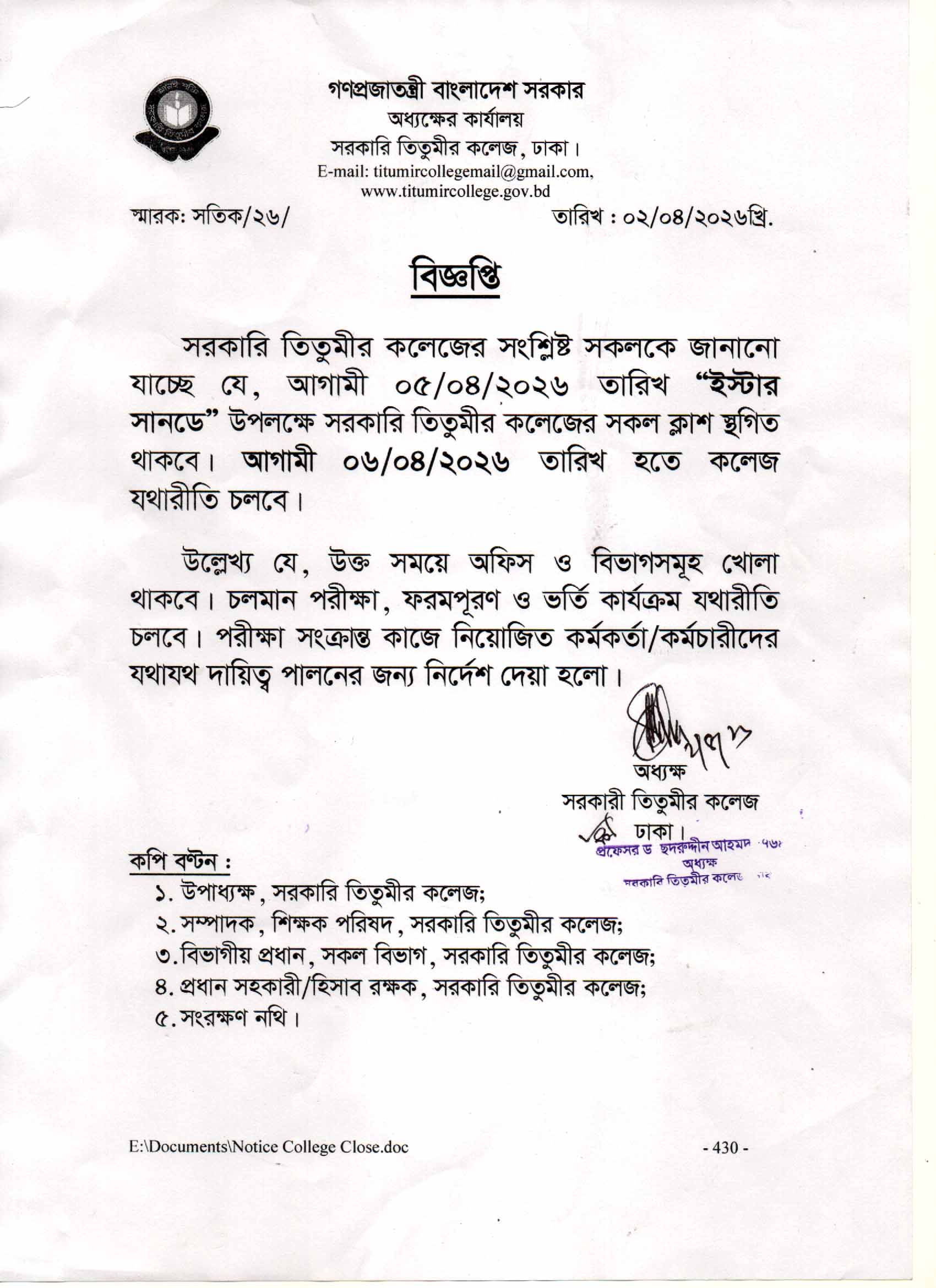 ইস্টার সানডে উপলক্ষে ক্লাস স্থগিত সংক্রান্ত নোটিশ