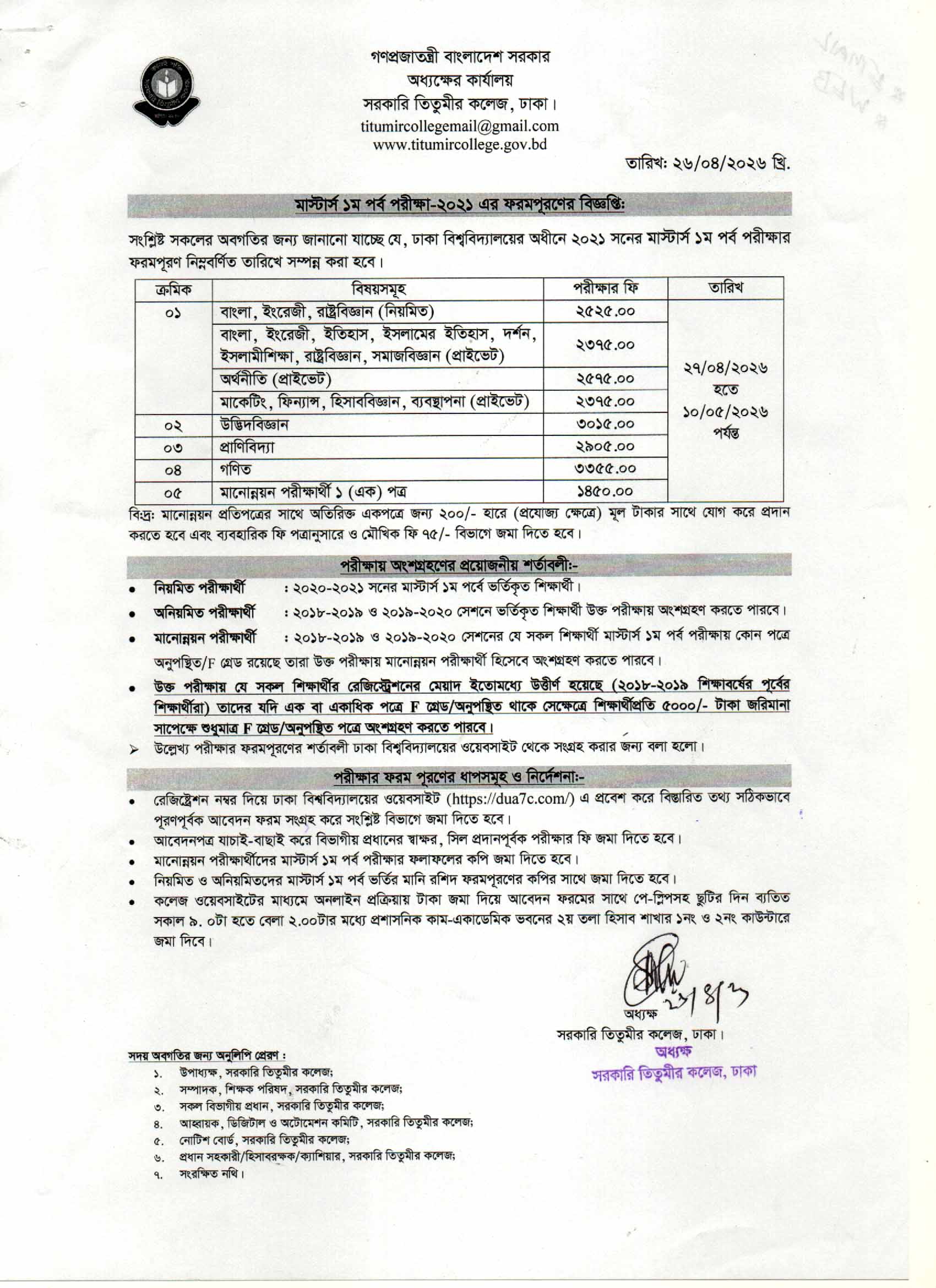 মাস্টার্স ১ম পর্ব পরীক্ষা-২০২১ এর ফরমপূরণের বিজ্ঞপ্তি