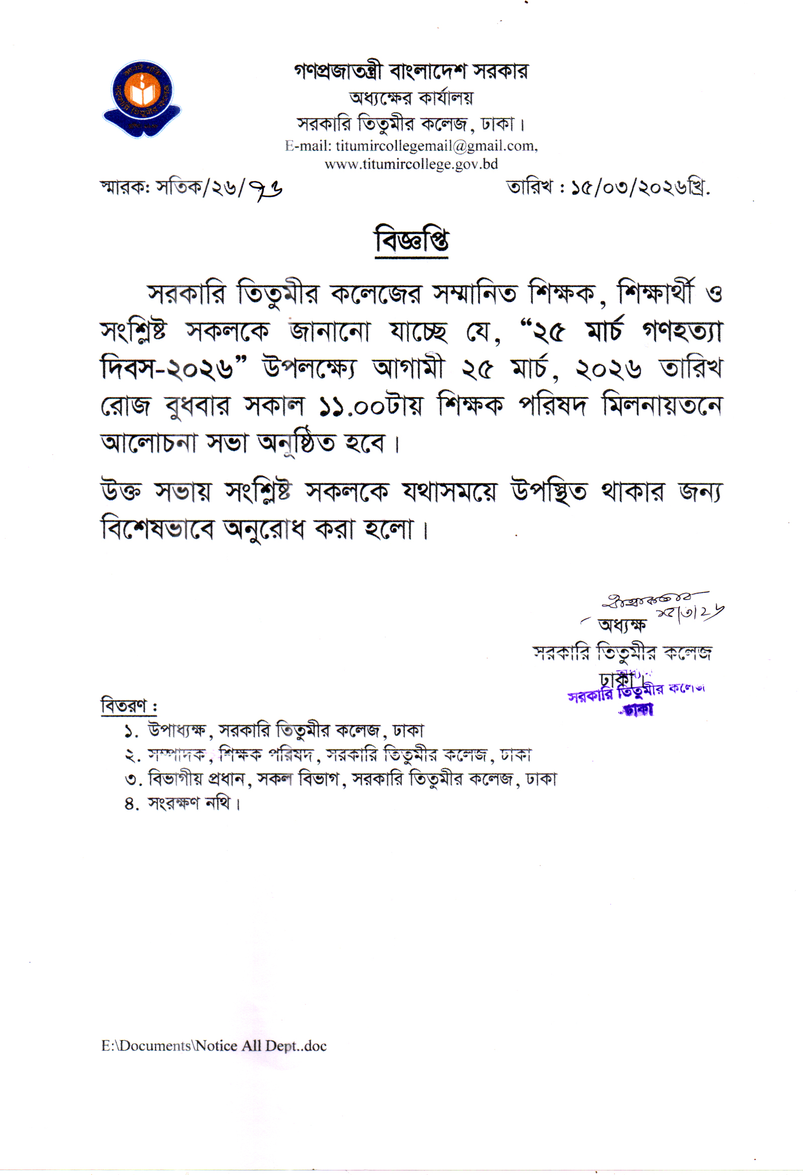 “২৫ মার্চ গণহত্যা দিবস-২০২৬’’ উপলক্ষ্যে আগামী ২৫ মার্চ আলোচনা সভা ।